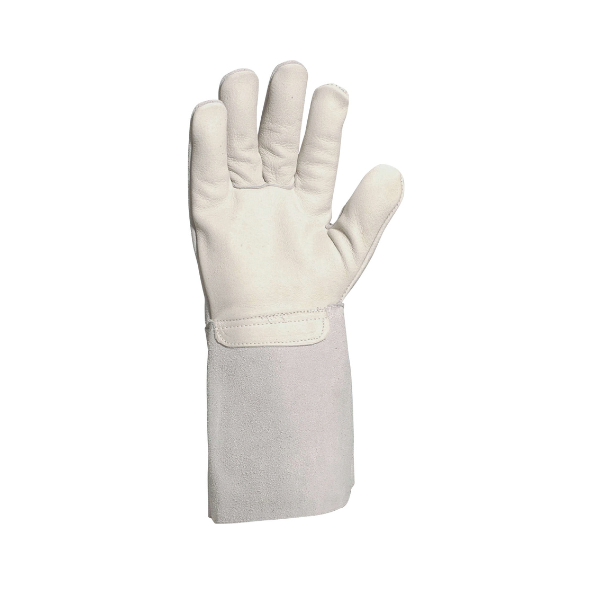 Перчатки для сварочных работ, устойчивые к контактному нагреву до 100°С. Материал: комбинированная кожа: ладонь – высококачественная воловья кожа, толщина от 0,9 до 1,1 мм; манжета и обратная сторона кисти – кожевенный воловий спилок; толщина – от 1,0 до 1,2 мм. Защита артерий.