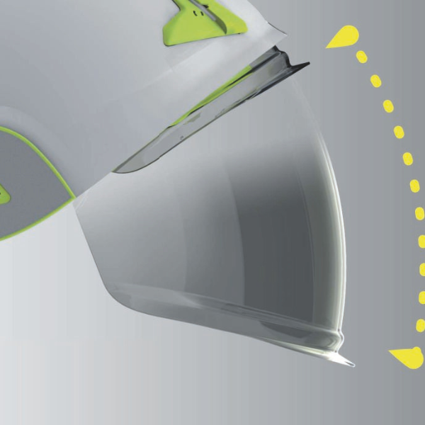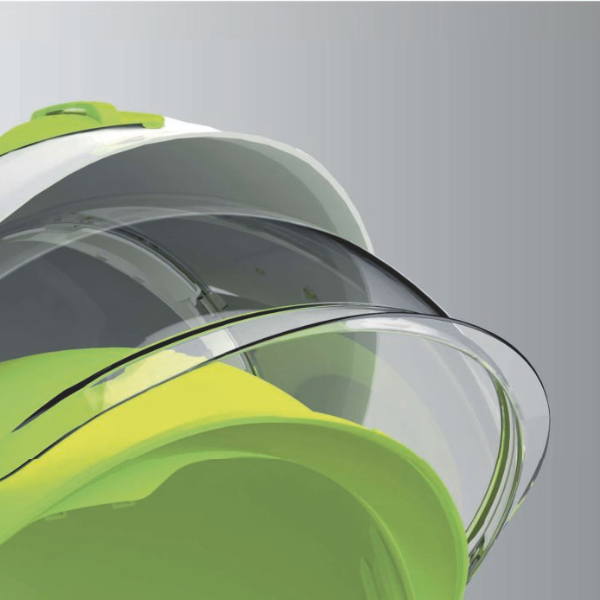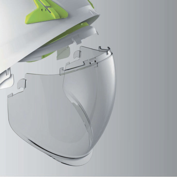 Щиток защитный лицевой изготовлен из литого прозрачного поликарбоната. Размер – 370 x 190 мм, толщина – 1,65/2,45 мм. Щиток крепится к внутренней оболочке каски, есть возможность изменения положения щитка – система складывания позволяет убрать щиток под каску. Защитные свойства щитка лицевого: для защиты от механических воздействий, брызг жидкостей расплавленного металла и горячих частиц, огнестойкость, устойчивость к оптическому излучению, к воздействию высокоскоростных частиц.